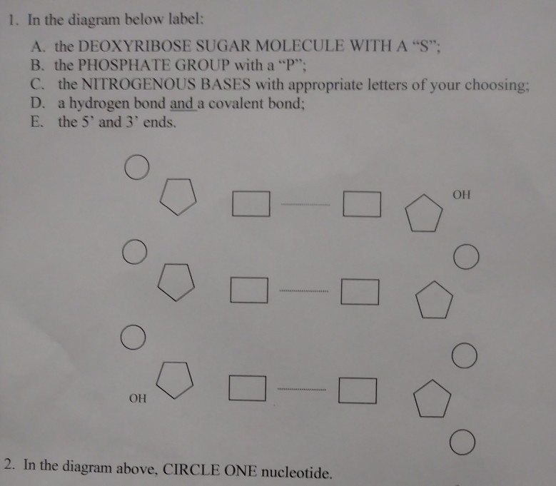 The Structure of DNA This figure is a diagram of a short stretch of a DNA molecule which is unwound and flattened for clarity. The boxed area at the lower left encloses one nucleotide. Each nucleotide is itself make of three subunits: A five carbon sugar called deoxyribose (Labeled S) Draw And Label A Dna Nucleotide Indicating The Position And Number Of ... See below the above structure is a color (magenta)nucleotide. 3.3.5 draw and label a simple diagram of the molecular structure of dna. Draw the general structure of a nucleotide and a nucleoside. Nucleic acids are made up of chains of many repeating units called nucleotides (see bottom left of figure 1 below). Chapter 13 Flashcards | Quizlet The diagram represents DNA that is part of the RNA‑coding sequence of a transcription unit. The bottom strand is the template strand. 5′-GCATATGCGGTAC-3′3′-CGTATACGCCATG-5′5′-GCATATGCGGTAC-3′3′-CGTATACGCCATG-5′ Give the sequence found on the RNA molecule that is transcribed from the above DNA molecule.