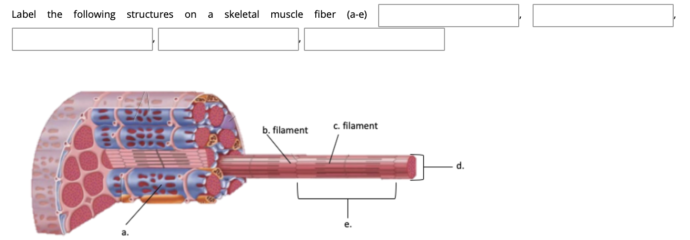 Structures of the Skeletal Muscle Fiber Flashcards | Quizlet -Muscle fibers are filled with threads called myofibrils separated by SR (sarcoplasmic reticulum) -Myofilaments (thick & thin filaments) are the contractile proteins of muscle that actually cause muscles to contract. Sarcoplasmic Reticulum (SR) -Stores Ca+2 in a relaxed muscle -Release of Ca+2 triggers muscle contraction Filaments and the Sarcomere Skeletal Muscle Fiber Labeling - Printable About this Worksheet. This is a free printable worksheet in PDF format and holds a printable version of the quiz Skeletal Muscle Fiber Labeling.By printing out this quiz and taking it with pen and paper creates for a good variation to only playing it online. Correctly Label The Following Parts Of A Skeletal Muscle Fiber A skeletal muscle fiber is composed of a plasma membrane and a specialized smooth endoplasmic reticulum. It also contains sarcomeres and calcium ions. In addition to the plasma membrane, a skeletal muscle fiber has numerous myofibrils. During a contraction, the force is transmitted through the tendon to the bone, producing a skeletal movement.