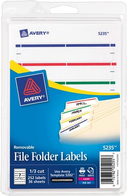 Avery Laser/Inkjet Permanent Print-or-Write File Folder Labels, White ... Avery 5202 Print-or-Write White File Folder Labels, 252/Pack, are ideal for labeling your three-tab file folders by hand or with your printer. ... Create custom label designs using Avery templates on your desktop or through the Avery website. Input the right fonts, letters, digits and symbols before printing easy-to-read labels in clean, crisp ...