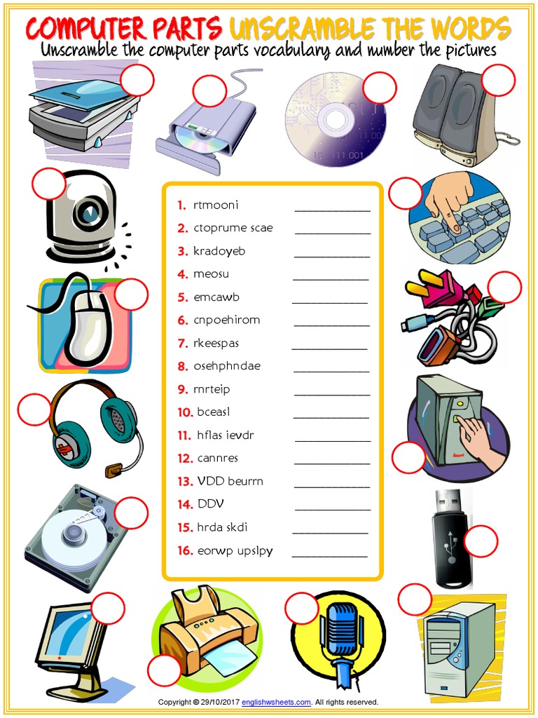 English ESL parts of the house worksheets - iSLCollective Here you are a cube to cut with the parts of the house. The pupils have to paint and write the name of the different rooms. The pupils have to paint and write the name of the different rooms. 17,948 Downloads Computer Parts Worksheets - TheWorksheets.CoM - TheWorksheets.com Computer hardware refers to the physical parts or components of a computer such as monitor, keyboard, Computer data storage, hard drive disk, mouse, system unit (graphic cards, sound cards, memory, motherboard and chips), etc. all of which are physical objects that you can actually touch. Computer Hardware are broadly divided into four types