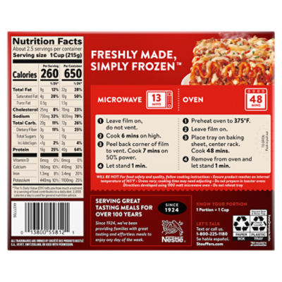 Stouffer's Family Size Lasagna with Meat & Sauce Frozen Meal - Walmart.com Nutrition facts. Refer to the product label for full dietary information, which may be available as an alternative product image. 5.0 Servings Per Container. Serving Size 1 Cup (215g) ... Stouffer's Family Size Lasagna with Meat & Sauce Frozen Meal offers a quick, easy solution for your next lunch or family dinner. ... Stouffer's Family Size Meat Lovers Lasagna Frozen Meal 34 oz - Walmart.com Nutrition facts. Refer to the product label for full dietary information, which may be available as an alternative product image. 4.5 Servings Per Container. Serving Size 1 Cup (213g) ... This Stouffer's Family Size lasagna pasta is easy to prepare, ideal for busy nights; Calories in Stouffer's Large Family Size, Lasagna with Meat & Sauce ... There are 320 calories in 1 serving of Stouffer's Large Family Size, Lasagna with Meat & Sauce, frozen. You'd need to walk 89 minutes to burn 320 calories. ... * The % Daily Value (DV) tells you how much a nutrient in a serving of food contributes to a daily diet. 2,000 calories a day is used for general nutrition advice. Your daily values may ... Lasagna & Meat and Sauce Large Family Size Meal | Official STOUFFER'S® 18g Protein Per Serving Freshly Made, Simply Frozen™ PRODUCT DETAILS How to Prepare Conventional Oven Instructions Step 1 Preheat 375°F. Leave film on tray, do not vent. Step 2 Place tray onto baking sheet on center rack. Step 3 Cook 80 minutes.* Uncover, continue cooking for an additional 5 minutes (TOTAL cook time 85 minutes*). Step 4