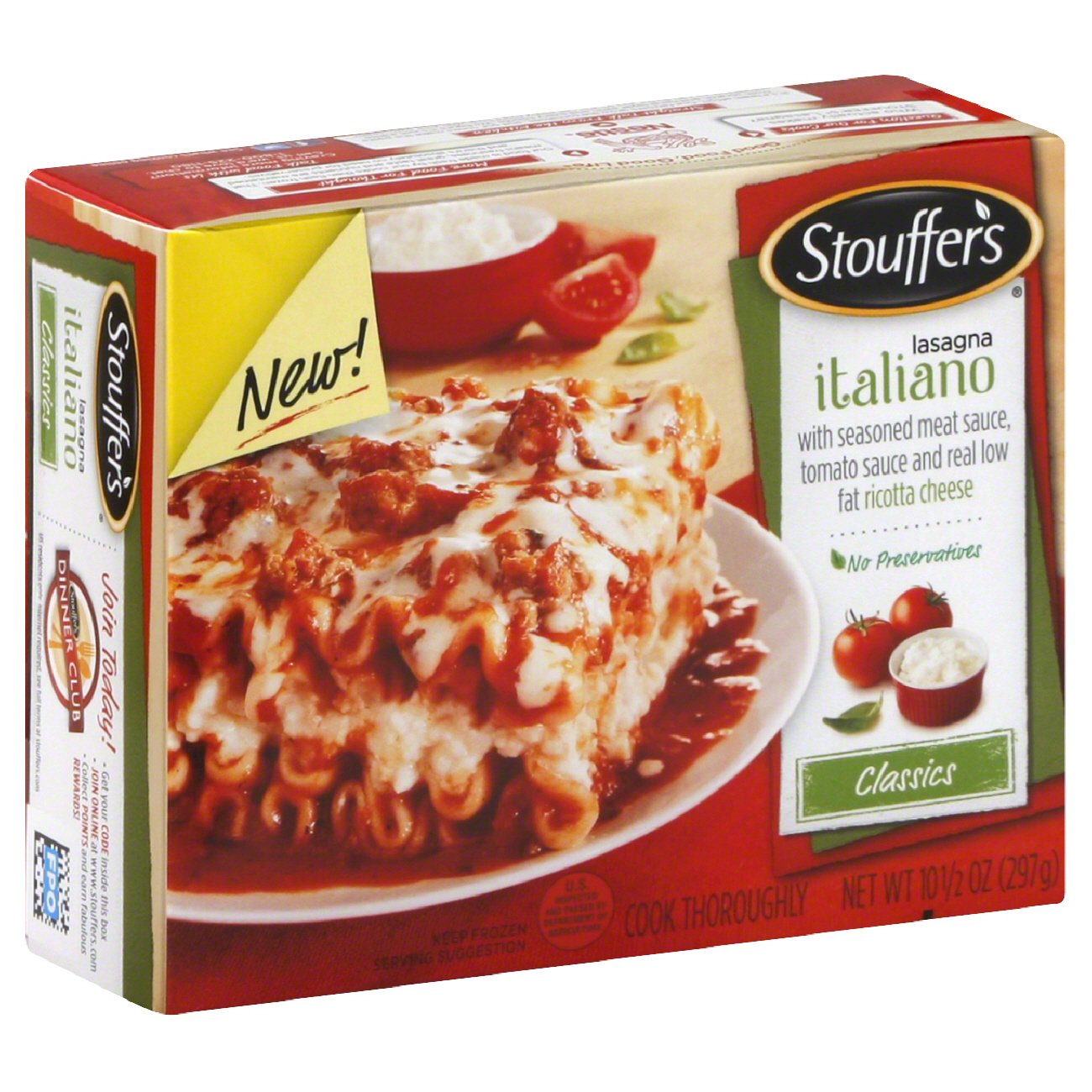 Stouffer's Family Size Lasagna with Meat Sauce Frozen Meal This frozen dinner offers 15 grams of protein per serving and is made with no preservatives. Stouffer's Family Size frozen meals are easy to prepare in the microwave or oven, making this frozen entree a great choice when you're short on time. Keep Stouffer's lasagna frozen meals in the freezer until you're ready to enjoy. From the Manufacturer