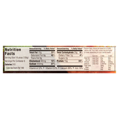 Calories in DiGiorno Four Cheese Pizza and Nutrition Facts - FatSecret DiGiorno Four Cheese Pizza Nutrition Facts Serving Size 1/5 pizza (126 g) Amount Per Serving Calories 310 % Daily Values* Total Fat 13.00g 17% Saturated Fat 6.000g 30% Trans Fat - Cholesterol 20mg 7% Sodium 830mg 36% Total Carbohydrate 37.00g 13% Dietary Fiber 4.0g 14% Sugars 3.00g Protein 14.00g Vitamin D - Calcium - Iron - Potassium - Rising Crust Mac and Cheese Frozen Pizza | Official DIGIORNO® - goodnes Step 1 Preheat & bake at 400°F. Keep pizza frozen while preheating. Step 2 Remove pizza from freshness wrap. Step 3 Place pizza directly on center oven rack. Step 4 Bake 28 minutes. Enjoy! Tips WHY IT'S SO TASTY Made with Real Cheese Fresh Baked Taste Fresh Baked Aroma Rising Crust IT'S NOT DELIVERY. IT'S DIGIORNO®. Nutrition NEED MORE PIZZA? Thin Crust Four Cheese Frozen Pizza | Official DIGIORNO® - goodnes Step 1 Preheat & bake at 400°F. Keep pizza frozen while preheating. Step 2 Remove pizza from freshness wrap. Step 3 Place pizza directly on center oven rack. Step 4 Bake 16 to 18 minutes. Tips WHY IT'S SO TASTY 100% Real Cheese Fresh Baked Taste Fresh Baked Aroma Thin Crust Signature Sauce Stone Baked for a crispy crust Nutrition NEED MORE PIZZA?