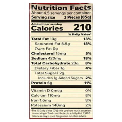 Digiorno nutrition label. DiGiorno Rising Crust Pizza Pepperoni Original - Giant Food DiGiorno Rising Crust Pizza Pepperoni Original 27.5 oz box See Best Price Nutrition 300 Calories 5g Sat Fat 750mg Sodium 6g Sugars Nutrition Facts 6 servings per container Serving Size 0.0625 pizza Amount per serving Calories 300 % Daily Value* Total Fat 11g 14 Saturated Fat 5g 25 Trans Fat 0g Cholesterol 25mg 8 Sodium 750mg 33 Total Carbohydrate Calories in DiGiorno Pepperoni Classic Thin Crust Pizza, frozen ... Where do the calories in DiGiorno Pepperoni Classic Thin Crust Pizza, frozen come from? 19.8% 41.9% 38.4% Protein Total Fat Total Carbohydrate 340 cal * The % Daily Value (DV) tells you how much a nutrient in a serving of food contributes to a daily diet. 2,000 calories a day is used for general nutrition advice. Tombstone (pizza) - Wikipedia Tombstone is a brand of frozen pizza.It is available with a variety of toppings, including pepperoni, mushrooms, olives, onions, bell peppers, and sausage.The package design typically includes images of a cactus and the pizza. DIGIORNO Pizza, pepperoni topping, rising crust, frozen, baked The detailed table of nutrients composition above for DIGIORNO Pizza, pepperoni topping, rising crust, frozen, baked is broken down into macro-nutrients (dietary elements) and micro-nutrients, which are source of nourishment essential for human body growth and maintenance.