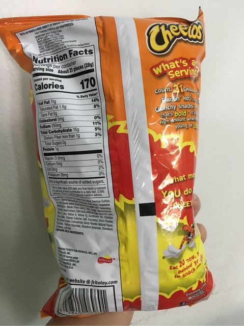 Hot cheetos big bag calories. Hot Cheetos Nutritional Facts | livestrong Although Hot Cheetos contain a significant number of calories, fat and sodium, the snack does provide some essential vitamins and minerals. Each serving offers 2 percent the recommended daily value for iron and riboflavin, as well as 4 percent of the recommended daily value for vitamin E, thiamin and niacin. Calories in Hot Cheetos - Calorie, Fat, Carb, Fiber, & Protein Info Calories in Hot Cheetos based on the calories, fat, protein, carbs and other nutrition information submitted for Hot Cheetos. ... 3 1/4 Oz Bag Of Hot Cheetos (times By 3.5 For Whole Bag) (1 serving) Calories: 170, Fat: 11g, Carbs: 14g, Protein: 2g. Show full nutrition information Flamin' Hot Cheetos Ignite Nutrition Debate in Schools The "new bigger size" bag of Flamin' Hot Cheetos contains 3 3/4 oz., or nearly 680 calories, 44 grams of fat, and 40 percent of day's recommended sodium, according to the package nutritional label. HOT CHEETOS BIG BAG RECIPES All You Need is Food Hot Cheetos have 170 calories per 1-ounce serving, approximately 21 pieces, with 100 calories coming from fat. They have 11 grams of total fat, which includes 1.5 grams of saturated fat, but they do not contain any trans fat or cholesterol. Regularly consuming high-calorie, high-fat foods, including this particular snack, may increase your risk ...