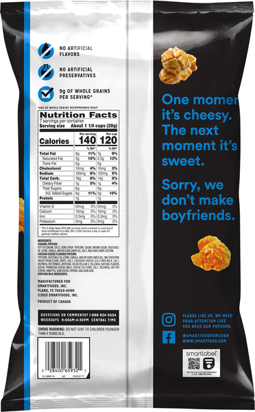 Smartfood Popcorn White Cheddar Cheese - Allergen Inside Smartfood Popcorn White Cheddar Cheese SMARTFOOD brand's fresh-tasting, light-textured SMARTFOOD popcorn varieties always seem to keep the fun popping. In our book, being smart is always in great taste., UPC Code 028400014236 Manufactured by Smartfoods, Inc. ... Nutrition Label. Nutrition Facts. Serving Size 1.00 package. Amount Per Serving ... Smartfood Popcorn, White Cheddar, 9.75 oz - Walmart.com Smartfood Popcorn Smartfood Popcorn, White Cheddar, 9.75 oz (4.5) 637 reviews $4.48 $4.98 45.9 ¢/oz Add to cart Size: 9.75 oz 9.75 oz $4.48 45.9 ¢/oz Pickup at Sacramento Supercenter Aisle A25 Delivery from store Check eligibility Add to list Add to registry Get free delivery, shipping and more* *Restrictions apply Start 30-day free trial Smartfood Caramel & Cheddar Mix Flavored Popcorn, 7 oz Bag ... Smartfood first hit shelves in 1985 with a very smart idea: to create great tasting, ready-to-eat popcorn with quality ingredients. Today, you may know us for our notorious little black bag of White Cheddar deliciousness, but we also make a lineup of other air-popped flavors, ranging from Movie Theater Butter to Hot Buffalo and Sour Cream & Onion. SMARTFOOD ® White Cheddar Cheese Flavored Popcorn 10 Multi-Pack Includes. 10 SMARTFOOD ® White Cheddar Cheese Flavored Popcorn - 5/8OZ. each. Nutrition Facts. SMARTFOOD ® White Cheddar Cheese Flavored Popcorn. Serving per containers. 10. Serving size. 1 Package. Amount Per Serving.