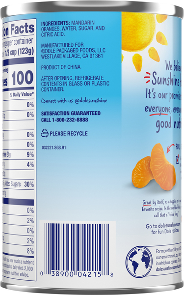 Mandarin Oranges with No Sugar Added 16oz - Dole® Sunshine Nutrition Information ; Total Carbohydrate, 10g, 3% ; Dietary Fiber, 1g, 4% ; Sugars, 5g, - ; Protein, 1g, - ; Potassium, 125mg, 4%.